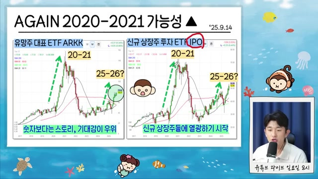 - 고점 신호: 유동성 장세의 끝에서 나타나는 고점 신호는 유망주 ETF인 아크(ARK)와 IPO ETF가 먼저 고점을 치고 내려가기 시작하는 것이다.