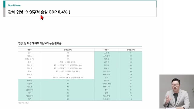- 한국 경제 영향: 한국은 자유무역협정으로 0%에 준하는 관세율이었으나, 이제 15% 이상 높아질 가능성이 있어 한국 경제에 영구적으로 0.4% 정도의 하방 압력으로 작용할 수 있다.