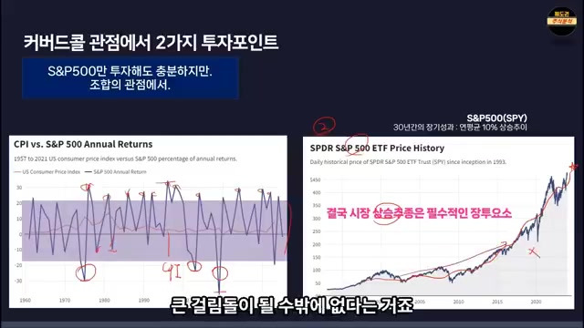 - 주황색으로 표시된 CPI(물가 지수)와 S&P 500의 움직임을 비교했을 때, S&P 500은 물가 상승보다 더 큰 수익을 대부분의 환경에서 기록할 수 있음이 확인된다.