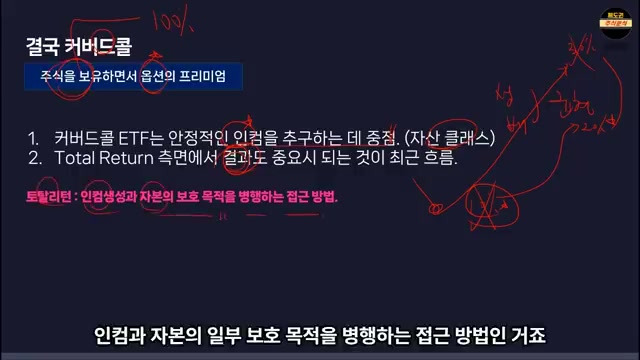 - 커버드 콜은 시장의 상승과 하락 범위를 제한하는 효과가 있으며, 그 보상으로 현금 흐름(배당)을 지급한다.