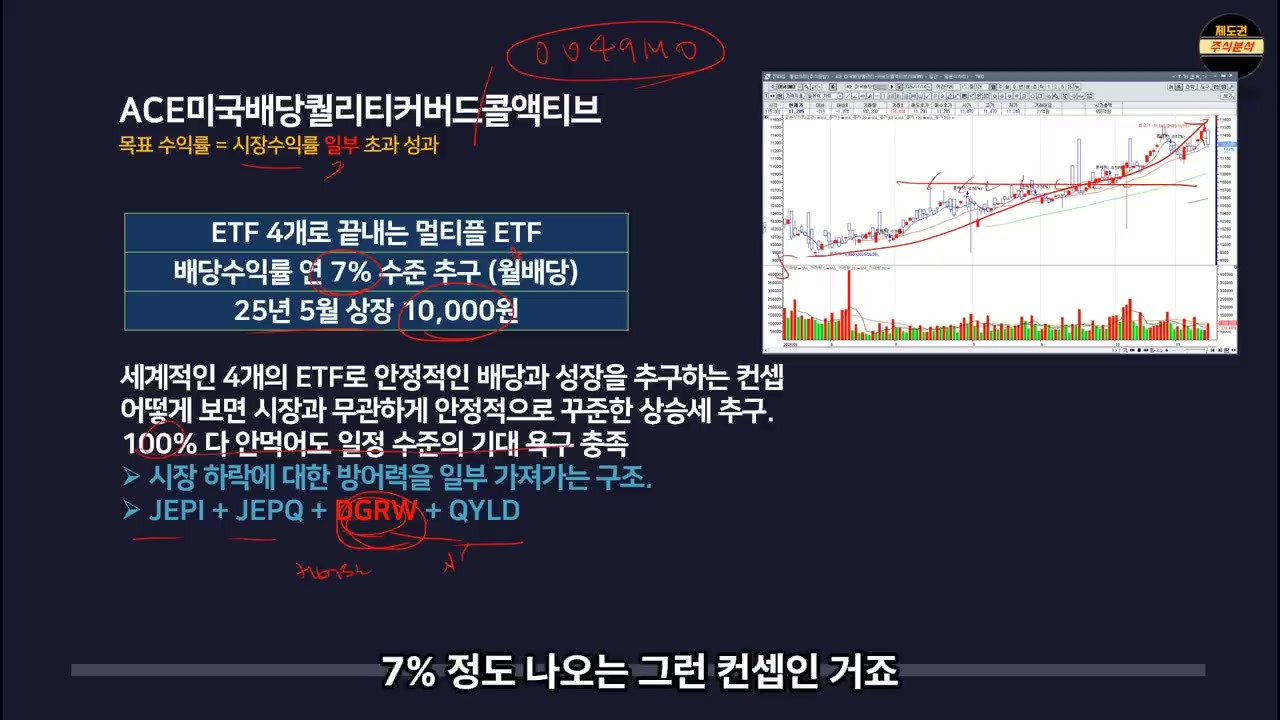 - 이 상품은 JEPQ, JEPI, QYLD 같은 커버드 콜 ETF가 추구하는 고배당과 달리, 배당 성장과 주가 상승을 동시에 추구하며 시장 수익률 이상의 초과 성과를 노린다.