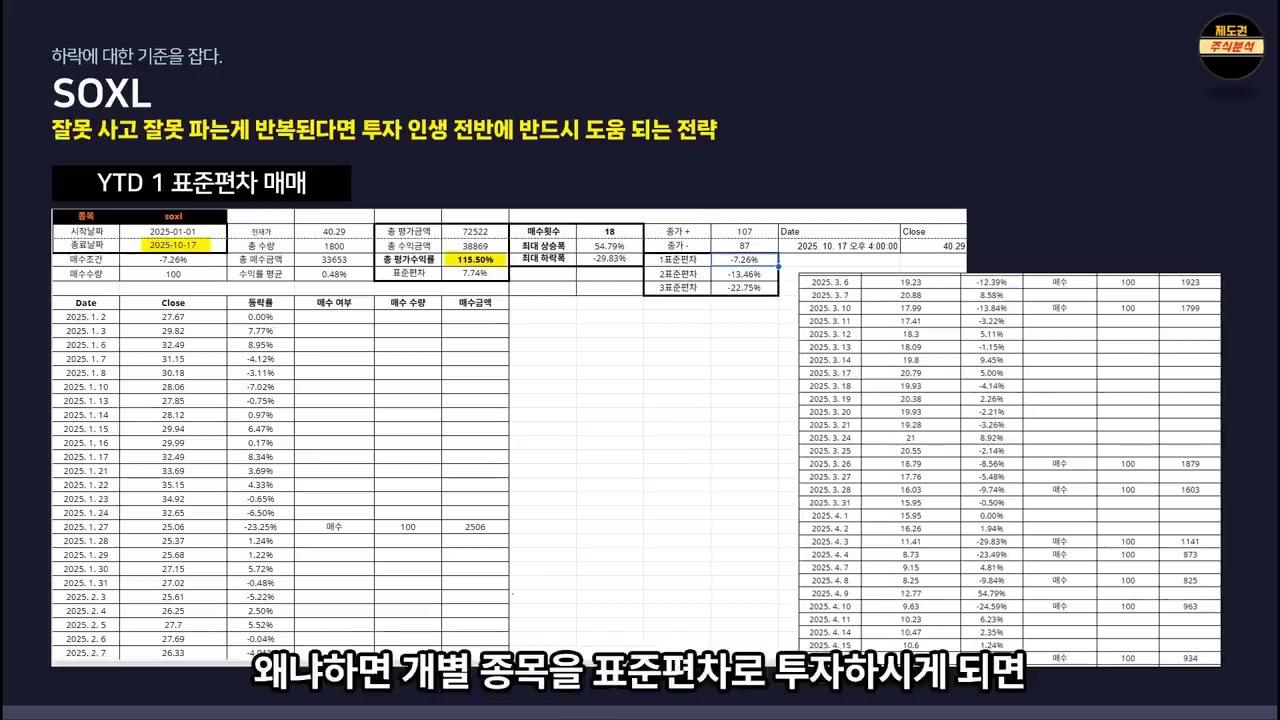 SOXL에 대한 표준 편차 마틴게일 전략을 활용하여 시장의 공포 구간에서 분할 매수하고, 장기적인 반도체 산업 성장을 기다려 폭발적인 수익을 얻는 것입니다.
