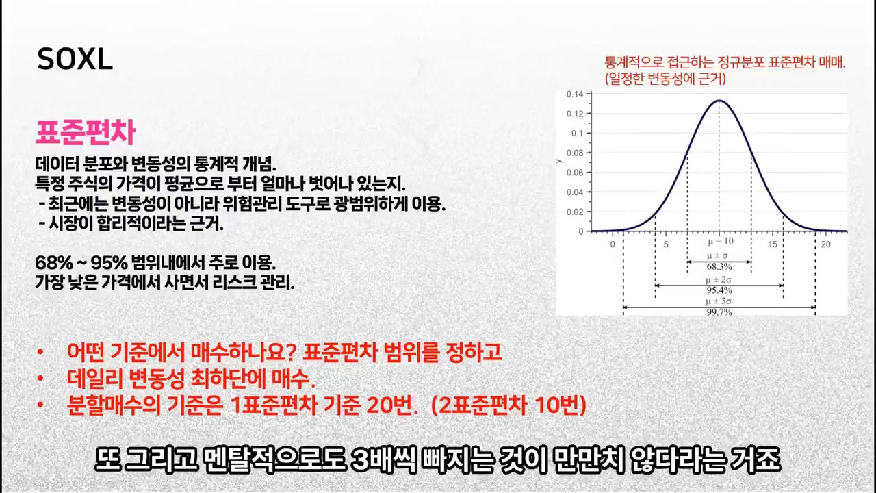 표준 편차를 활용하여 통계적으로 최하단에 도달했을 때 분할 매수하는 것이 핵심입니다. 이는 레버리지 상품의 높은 변동성으로 인한 손실 위험을 줄이고 수익률을 극대화하는 전략입니다.