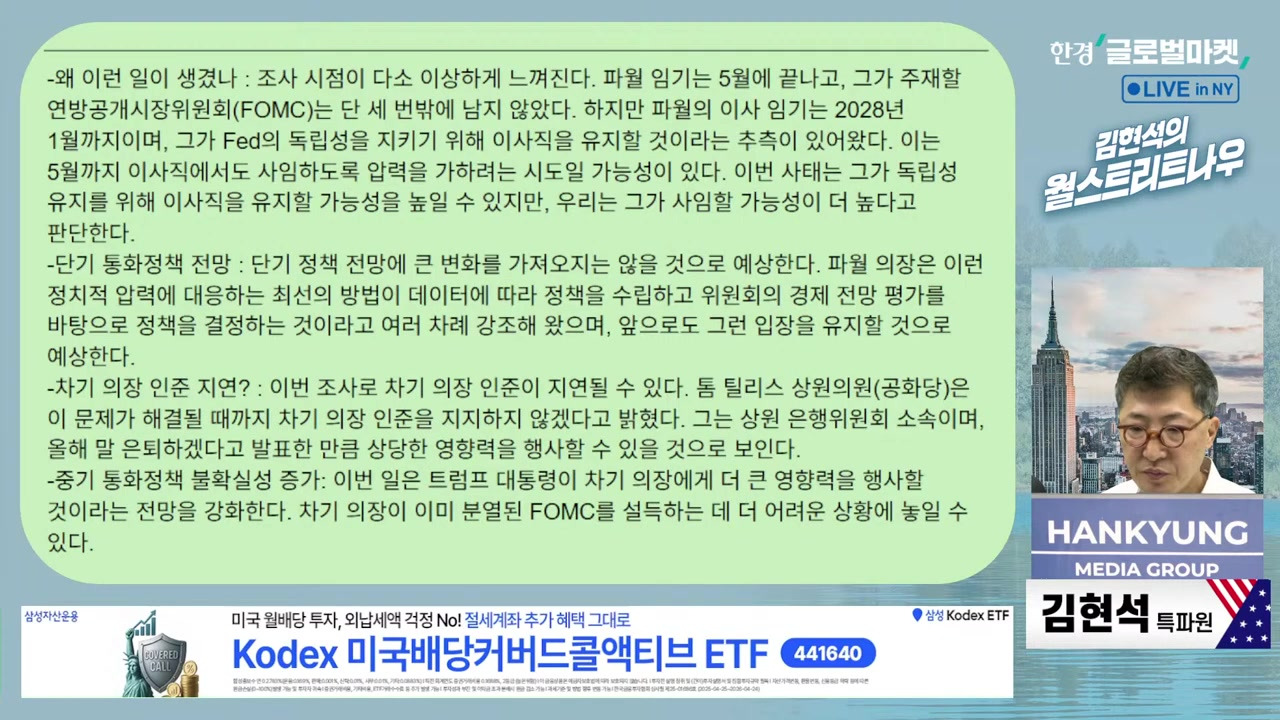 - 웰스파고는 이번 사태가 파월 의장이 독립성 유지를 위해 이사직을 유지할 가능성을 높일 수 있지만, 여전히 그가 사임할 가능성이 더 높다고 판단했다.