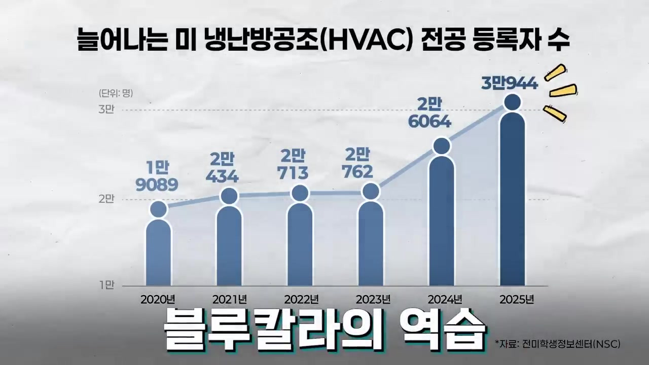 - 미국 학생 정부 센터에 따르면, 2025년 가을학기에 냉난방 공조 관련 프로그램에 등록한 학생 수가 31,000명에 달하며, 이는 전년 대비 18% 이상 증가한 수치로, 블루칼라의 역습이라고 불린다.