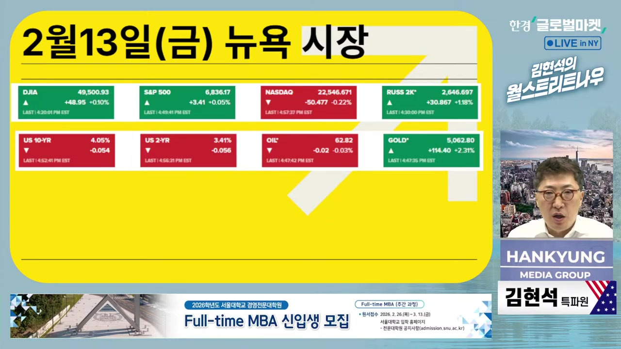 | [김현석의 월스트리트나우-2월12일] 믿기 어렵게 '좋은' 고용..워시가 가장 싫어한다? | 7000 못넘는 이유 이것 (1) | 2026.02.12 |