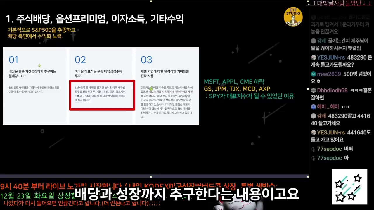- 코미성커 (신규 상장 ETF): 무조건 10% 이상의 배당을 추구하며 상장한다.