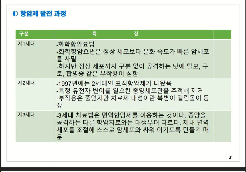 - 3세대 면역 항암제: 우리 몸의 면역 시스템을 이용해 암세포를 스스로 조절하고 싸워 이기도록 만드는 방식이다.