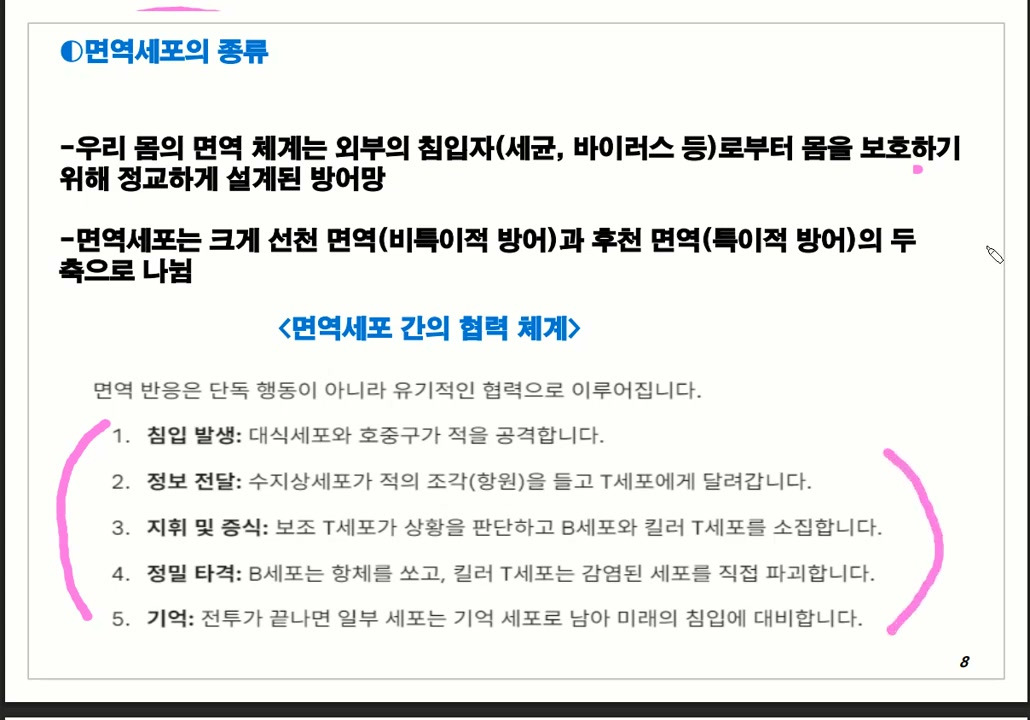 - 면역 체계는 세균, 바이러스, 암세포 등 외부 침입자로부터 몸을 보호하는 방어 시스템이다.